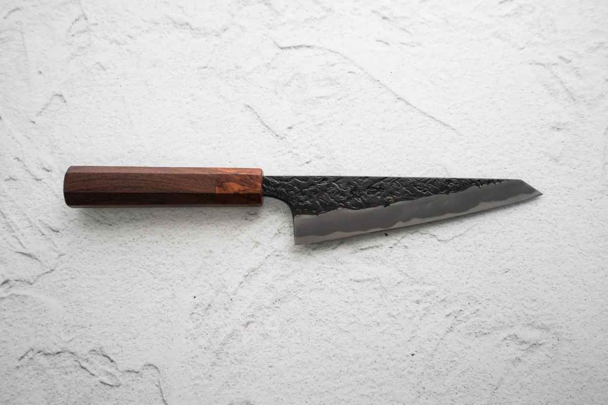 | Blade Material: | Blue 2 Carbon Steel core + Soft Iron Tsuchime Kurouchi Finish |