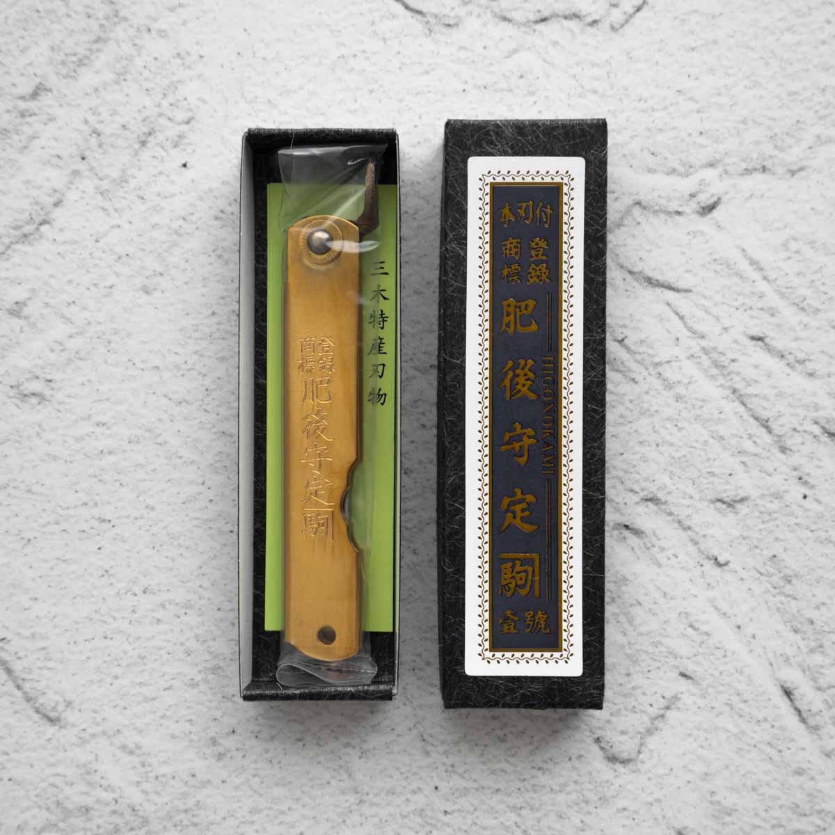 He named it “Higonokami Knife” because many of his customers were in Kumamoto area (formally Higo country), which turned out to dramatically increase his sales. The blades have gradually changed their shapes. Unlike single-edged knives, the double-edged blades (V-shaped cross section) were in those days considered common. The earlier blades had a sharper tip (shape of a bamboo leaf), but now they have square shapes. The sheaths had a vertically folding style and a cross folding style, now the vertical one has to be custom made.