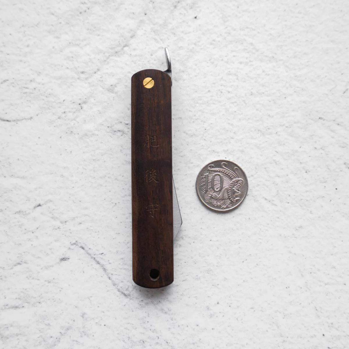 He named it “Higonokami Knife” because many of his customers were in Kumamoto area (formally Higo country), which turned out to dramatically increase his sales. The blades have gradually changed their shapes. Unlike single-edged knives, the double-edged blades (V-shaped cross section) were in those days considered common. The earlier blades had a sharper tip (shape of a bamboo leaf), but now they have square shapes. The sheaths had a vertically folding style and a cross folding style, now the vertical one has to be custom made.